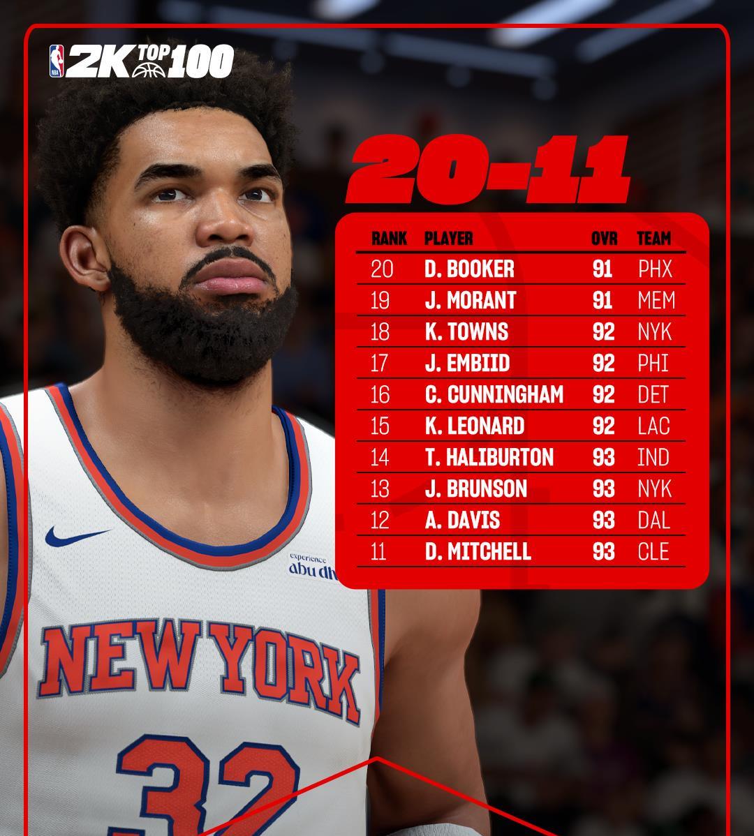当天NBA 2K官方公布了2K26智商值第11-20名,顺序是米切尔(93)、浓眉(93)、布伦森(93)、哈利伯顿(93)、小卡(92)、坎宁安(92)、恩比德(92)、唐斯(92)、莫兰特(91)和布克(91)。