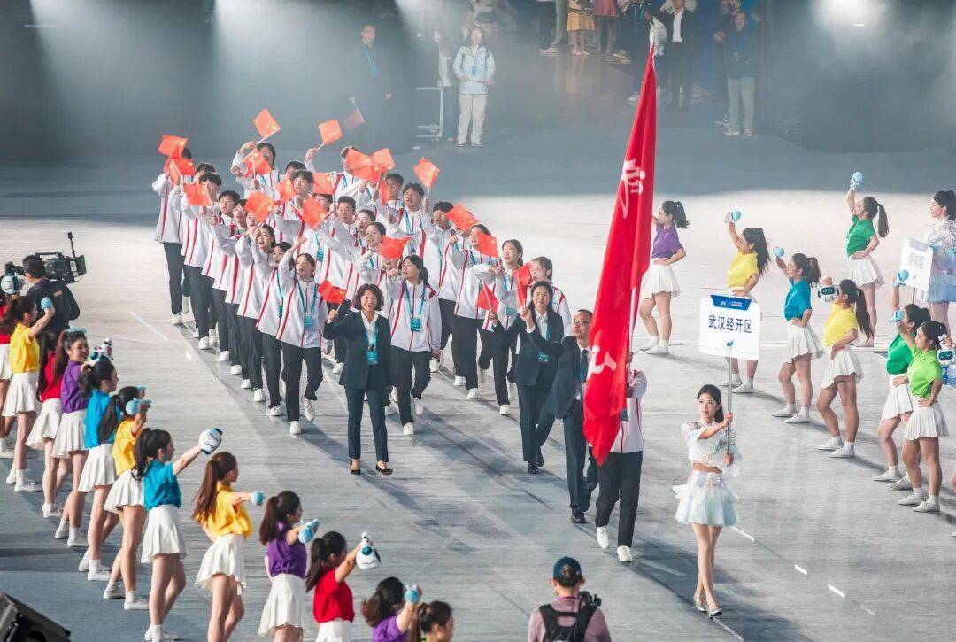 19时整,在现场不雅众珍爱的得意声中,24支体育代表团次第入场。武汉经开区代表团元气心灵充沛、标语嘹亮,以浪费珍爱展示着车谷健儿们的飞腾风仪。