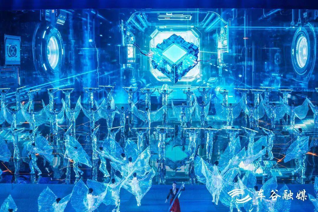 舞台大屏上,光影交汇间,江水奔涌、机械齿轮动掸,线索丰富、动感王人备,与演员们机动变换的队形短长分明。智能汽车巡游、全息投影、AI视频本领和立体LED屏幕系统平庸行使,“将来感”王人备。