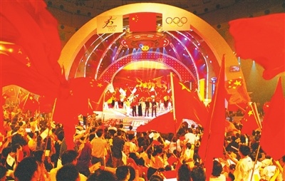 2001年7月13日,东说念主们在央视演播大厅庆祝北京申奥得手。