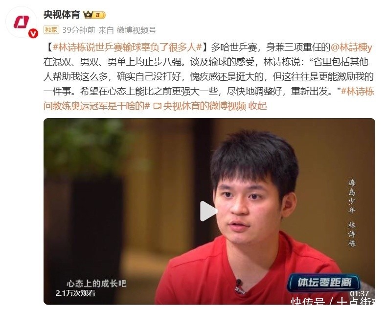 北京时间6月26日晚,央视《体坛零距离》播出了林诗栋专辑,其中他谈到了多哈世乒赛,“输球之后我方也会念念说,省里包括其他东说念主匡助我这样多,如实我方没打好,会有羞愧感。”濒临央视镜头,20岁的林诗栋坦诚辨白,2025年多哈世乒赛成为这位寰球男单世排第一选手做事糊口的狠毒课堂,身兼混双、男双、男单三项重担的他,最终沿途停步八强,当临了一拍球落在梁靖崑的台面,男单比分定格在3-4时,林诗栋蹲下身,缄默收起拍子,抑遏了我方三线溃逃的世乒赛之旅