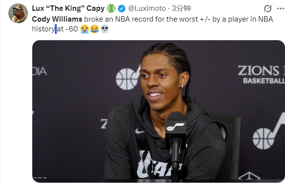 科迪-威廉姆斯出战32分钟,9投5中拿到15分2篮板,正负值低至-60体育赛事直播,创玷辱记载,成为NBA历史上单场正负值最低的球员;此前最低的是亨德森和厄尔共同创造的-58。